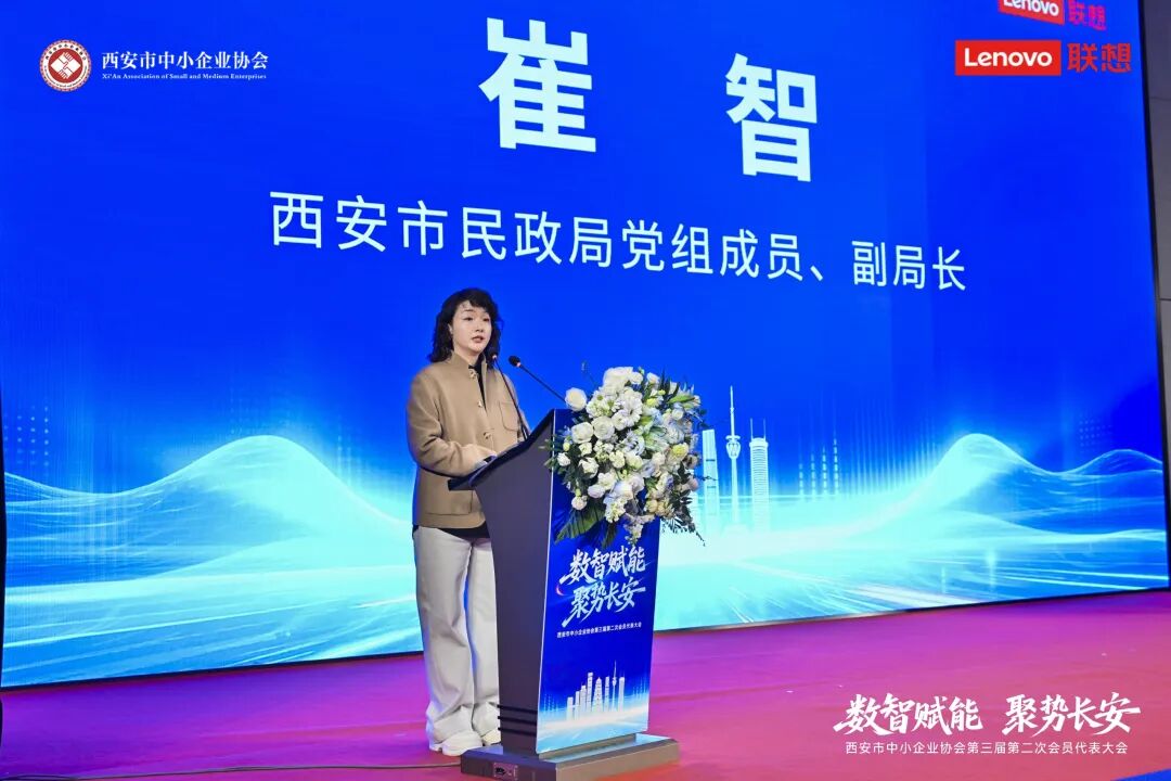 西安市民政局党组成员、副局长 崔智 出席会议并致辞。她对协会近年来的工作成果表示肯定,强调市民政局将持续支持协会发挥桥梁纽带作用,期待协会进一步团结广大会员,规范自身建设,提升服务能力,在促进西安市中小企业创新发展、优化营商环境等方面展现更大作为。