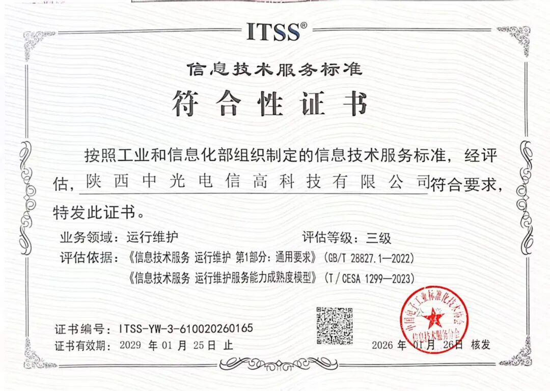 近日,陕西中光信息科技有限公司顺利通过专家组严格评审,正式获得由中国电子工业标准化技术协会颁发的 《信息技术服务标准》三级认证证书。这标志着我司在信息技术服务领域的运维管理、技术实力及服务质量已达到国家标准要求,综合能力迈上新台阶!
